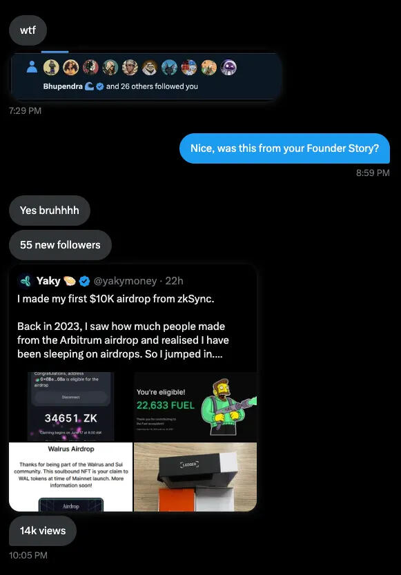 You can do this too by building an algo-proof reputation where others will naturally read your content because it’s just that good (instead of waiting for the algo to show your content to them).Trust is the basis of everything you do, and I’ll show you the exact steps on how to build this valuable asset, even when starting from zero (because I was there before).The future of airdrops belongs to Signal Creators, ones who share what they did onchain.