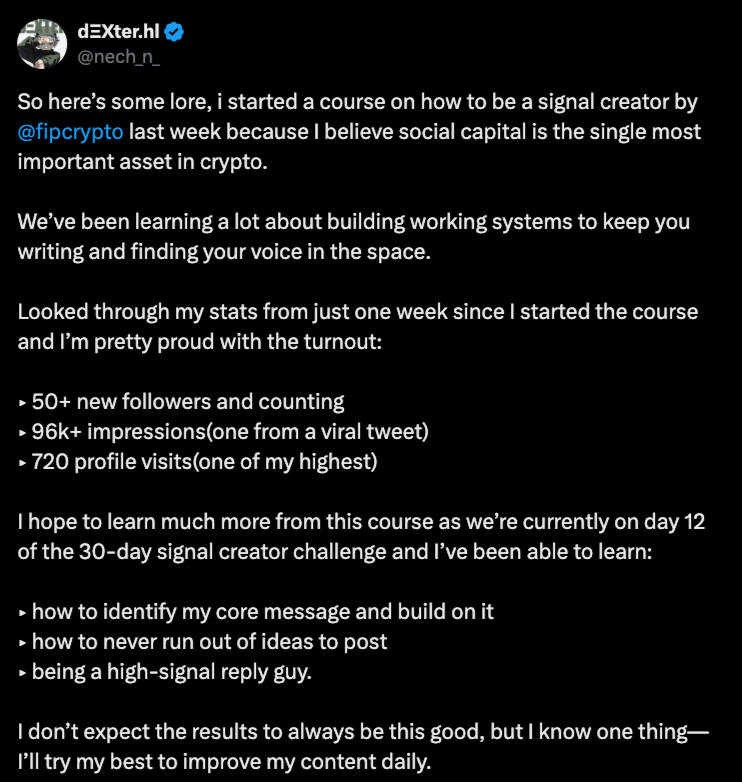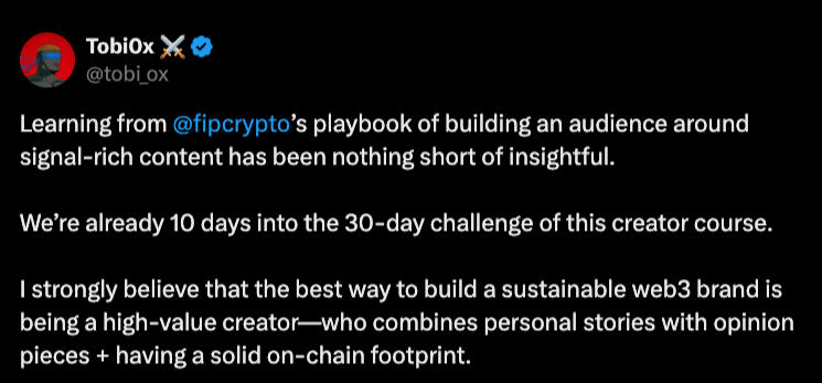 "I'm really interested to grow myself on X. As soon as I heard about FIP Crypto's bootcamp, I hopped in instantly, as I know how good of a creator he is. Been following him for a while now."