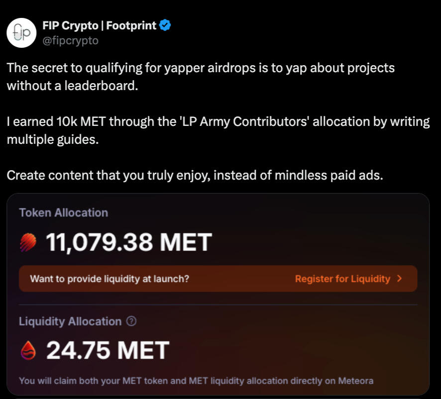 There’s no need to post about the same project over and over again for the airdrop.The real flex is by putting out high-quality posts and outcompeting the bot farms and yappers that spam posts, hoping to get something.This has happened to me multiple times just by talking about my own experiences without sounding like a shill: