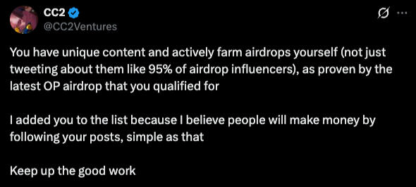 You can do this too by building an algo-proof reputation where others will naturally read your content because it’s just that good (instead of waiting for the algo to show your content to them).Trust is the basis of everything you do, and I’ll show you the exact steps on how to build this valuable asset, even when starting from zero (because I was there before).The future of airdrops belongs to Signal Creators, ones who share what they did onchain.